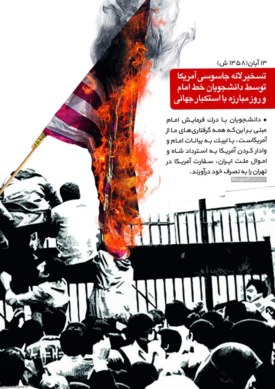یوم اللّه سیزده آبان، یادآور فداکاری های فرزندان دلیر انقلاب برای مقابله با ابرقدرت های چپاول گر و مبارزه با استکبار جهانی است.
