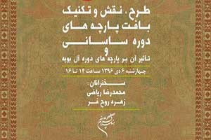نشست تخصصی «طرح، نقش و تکنیک بافت پارچههای دورۀ ساسانی و تأثیر آن بر پارچههای دورۀ آل بویه»، روز چهارشنبه، ۶ دی ۱۳۹۶ ساعت ۱۴ تا ۱۶، در سالن همایشهای فرهنگستان هنر برگزار می شود.