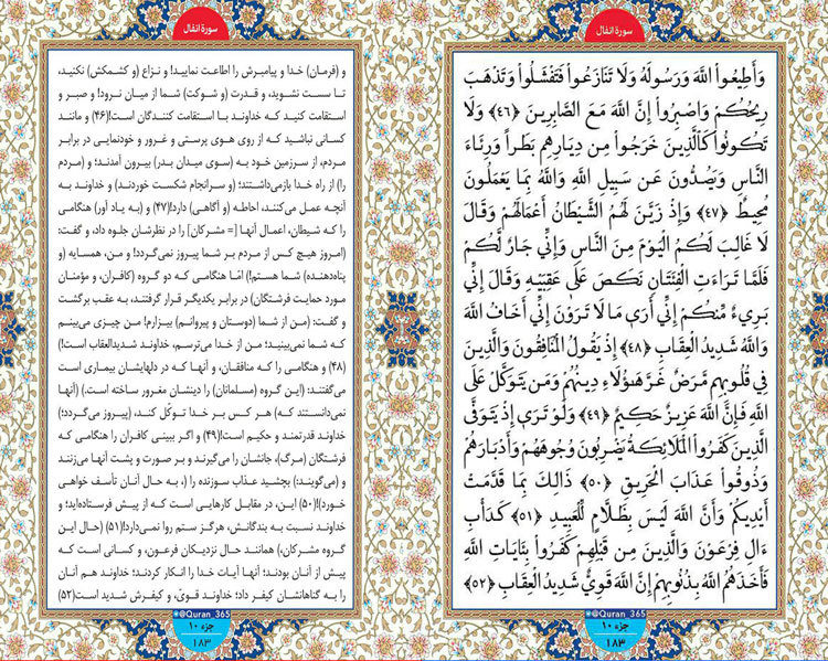 برای نورانیت قلوب هر روز یک صفحه از آیات قرآن را هم صدا با "مسعود افشار" و با ترجمه آیت الله "مکارم شیرازی" می خوانیم. سوره انفال ، آیات 46 تا 52  صفحه 183: