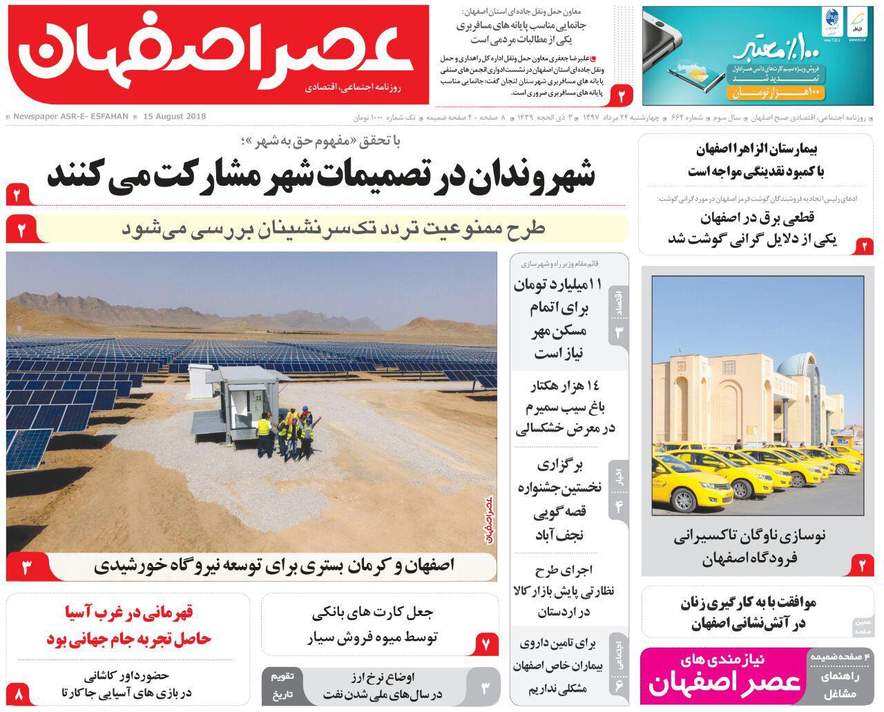 به گزارش خبرگزاری صدا و سیما ، مرکز اصفهان ؛ احضار دانه درشتها ، نصف جهان مردانه شد ، شهروندان در تصمیمات شهر مشارکت می کنند ، توقف طرح نیمه اصفهانی در ایستگاه سقائیان نژاد؟! و اصفهان طرح جامع ایمنی ندارد دیگر عناوین صفحه نخست روزنامه های امروز اصفهان است.