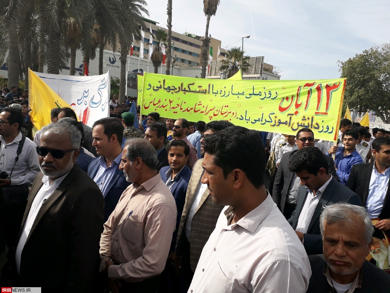 به گزارش خبرگزاری صدا و سیما مرکز خلیج فارس؛ راهپیمایی ۱۳ آبان امسال با حضور پرشور دانش آموزان، دانشجویان و دریادلان هرمزگانی درحال برگزاری است. شرکت کنندگان با سردادن شعار مرگ بر آمریکا، مرگ بر اسرائیل و اعلام انزجار از استکبار جهانی، به ندای رهبر فرزانهی انقلاب اسلامی حضرت آیت ا... خامنهای لبیک گفتند. راهپیمایان در بندرعباس پارچه نوشتههای در دست داشتند که بر روی آنها، ضرورت ادامه مبارزه با آمریکا و حمایت از مظلومان جهان نوشته شده است. این راهپیمایی در بندرعباس از میدان انقلاب، روبروی هتل هرمز تا مسجد جامع در حال برگزاری است. یوم الله ۱۳ آبان در شهرستانها و بخشهای استان نیز برگزار میشود. در تقویم جمهوری اسلامی ایران ۱۳ آبان، سالروز سه مناسبت تاریخی تسخیر لانه جاسوسی آمریکا، روز ملی مبارزه با استکبار جهانی و روز دانش آموز است.