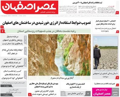 به گزارش خبرگزاری صداوسیما ،مرکز اصفهان ؛ تصویب ضوابط استفاده از انرژی خورشیدی در ساختمانهای اصفهان ، نیاسر میزبان هجدهمین آیین گلابگیری ، سنگ اصفهان به مدرسه می شود و تجمع با هماهنگی قبلی اشکال ندارد، دیگر عناوین روزنامه های امروز اصفهان است .
