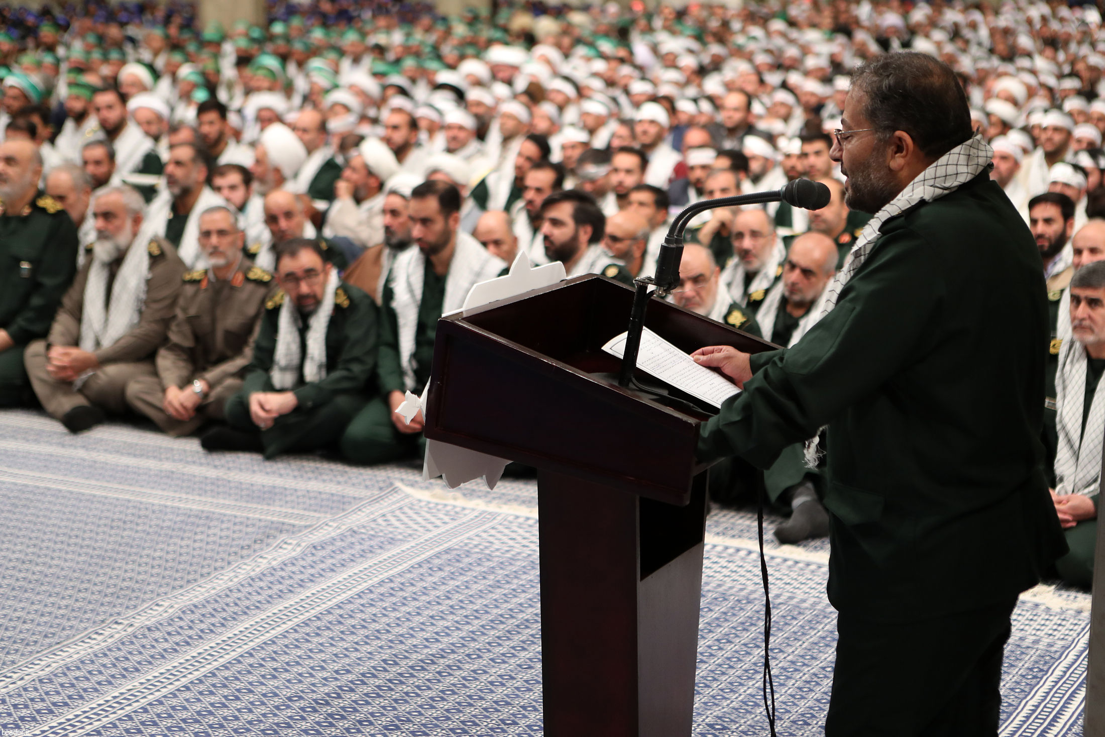 پیش از سخنان رهبر معظم انقلاب اسلامی، سردار سرلشکر پاسدار سلامی فرمانده کل سپاه پاسداران انقلاب اسلامی در سخنانی با اشاره به نگرانی نظام سلطه از تکثیر الگوی الهامبخش انقلاب اسلامی گفت: بسیج قلب نیروی نرم کشور است و مبنای حرکت آن در گام دوم انقلاب برای غلبه بر تهدیدها، گسترش فعالیتهای فکری، فرهنگی و جهادی در سطح جامعه است.