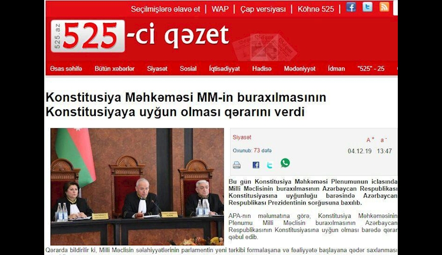 - دادگاه قانون اساسی جمهوری آذربایجان طرح انحلال مجلس ملی را مطابق قانون اساسی دانست و رأی به حفظ اختیارات مجلس تا برگزاری انتخابات زود هنگام داد.