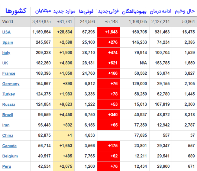 به گزارش سرویس بین الملل خبرگزاری صدا و سیما، براساس آخرین آمار سازمان بهداشت جهانی، شمار مبتلایان به ویروس کووید ۱۹ (کرونا) در جهان، ۳ میلیون و ۴۷۹ هزار و ۸۷۵ هزار نفر، شمار جانباختگان ۲۴۴ هزار و ۵۹۶ نفر و شمار بهبودیافتگان ۱ میلیون و ۱۰۸ هزار و ۶۵ نفر است.