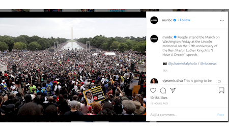 به گزارش سرویس بین الملل خبرگزاری صداوسیما شبکه تلويزيوني ام اس ان بی سی در صفحه اینستاگرام خود نوشت هزاران نفر در مراسم گرامیداشت پنجاه و هفتمین سالگرد مرگ مارتین لوتر کینگ در واشنگتن شرکت کردند.