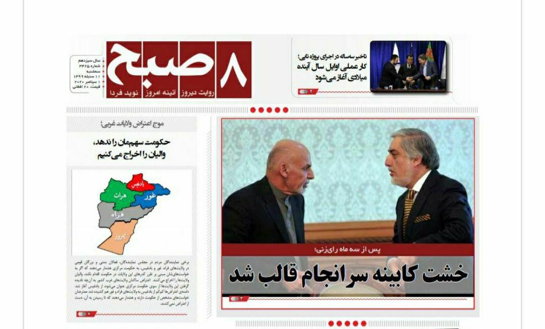 - سرانجام پس از سه ماه رایزنی، خشت کابینه افغانستان قالب شد، ترکیب کابینه دولت جدید این کشور اعلام شد.