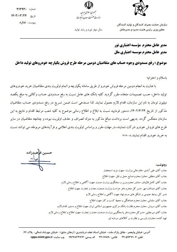 در نامه حسین فرهید زاده آمده است: با عنایت به انجام دومین مرحله فروش خودرو از طریق سامانه یکپارچه و اتمام اولویت بندی متقاضیان خرید خودروهای تولید داخل، حسب تصمیمات متخذه مقرر گردید کلیه بانکهای عامل نسبت به رفع مسدودی حساب وکالتی به مبلغ یکصد میلیون تومان به نام این سازمان، اقدام نمایند.