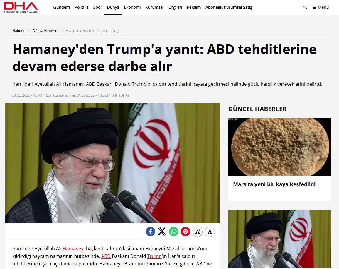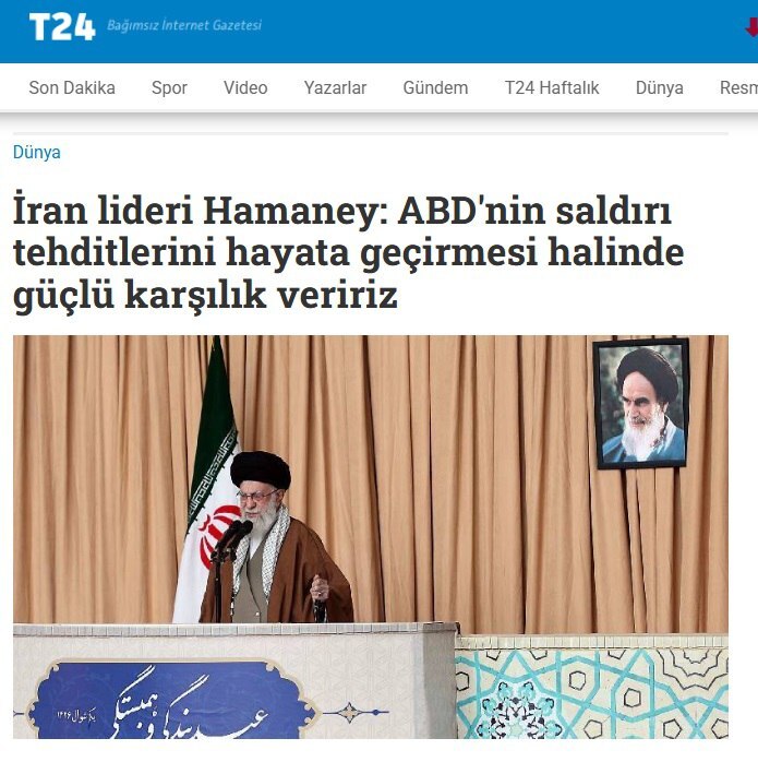 به گزارش سرویس بین الملل خبرگزاری صدا و سیما از آنکارا، شبکه خبری خبر ترک در وبگاه اینترنتی خود در خبری با عنوان رهبر دینی ایران گفت اگر آمریکا تهدیدهای نظامی خود را به اجرا بگذارد واکنش شدیدی نشان خواهیم داد نوشت: آیت الله علی خامنهای رهبر دینی ایران با بیان اینکه احتمال نمیدهیم دونالد ترامپ رییس جمهور آمریکا به تهدیدهای خود عمل کند گفت ولی اگر این اقدام صورت بگیرد، ایران پاسخ شدیدی به آن خواهد داد.