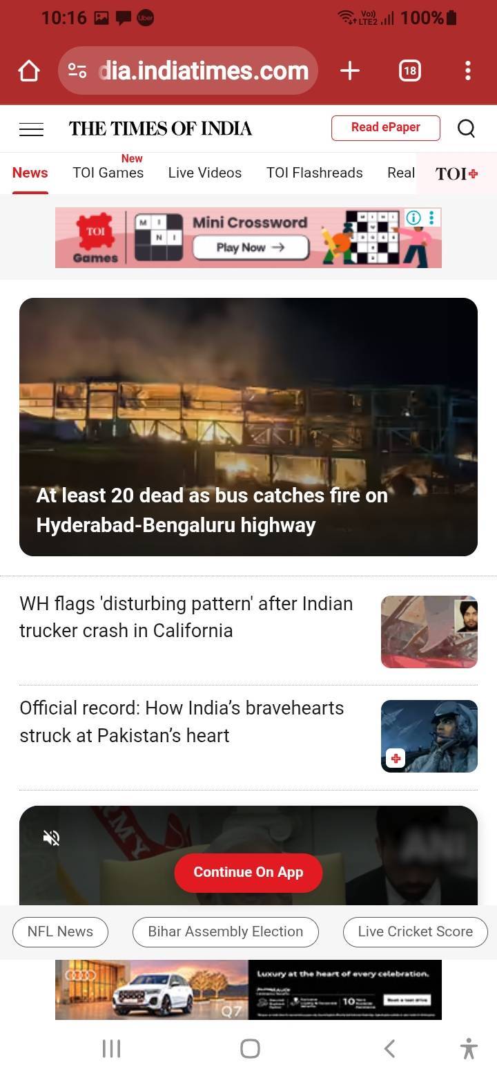 - آتش گرفتن اتوبوس در بزرگراه حیدرآباد-بنگالورو دست کم ۲۰ کشته بر جای گذاشت