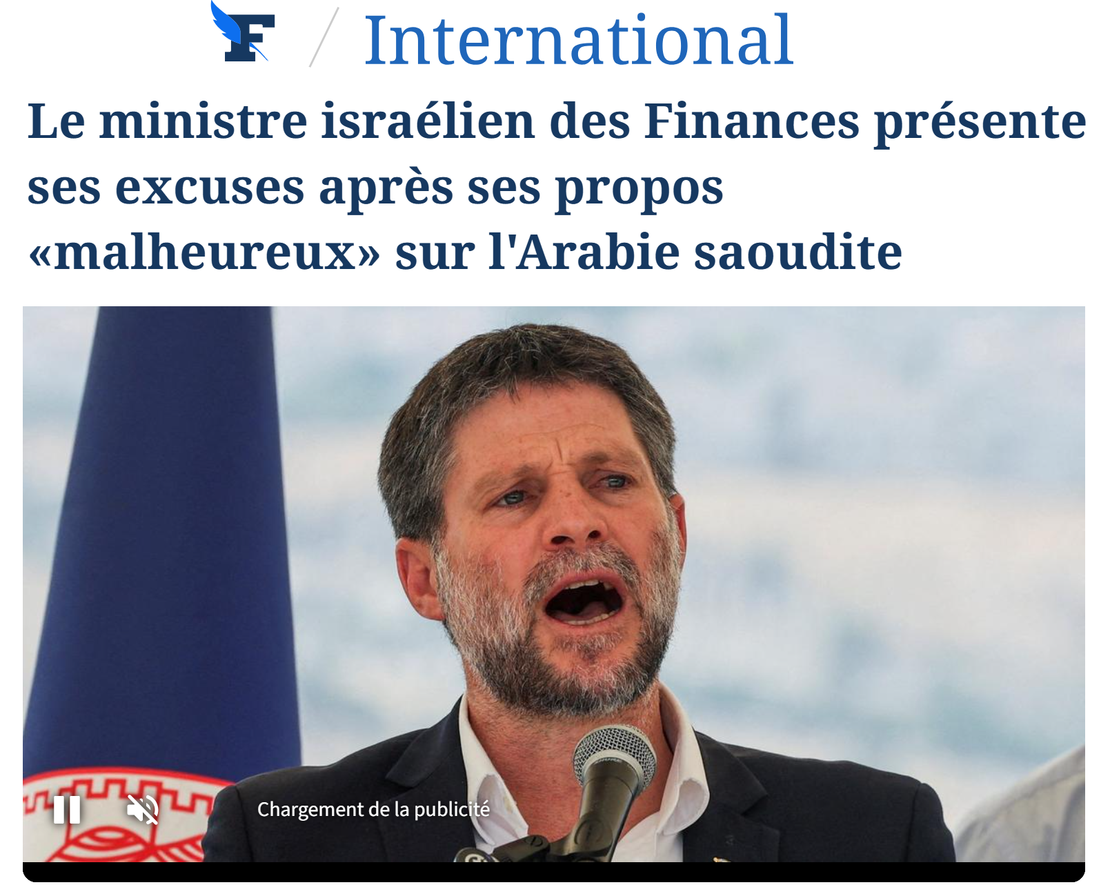 - عذرخواهی وزیر دارایی رژیم اسرائیل از عربستان سعودی. او پیشتر در جواب عربستان سعودی که اعلام کرده بود در صورت تشکیل دو دولت، روابط با اسرائیل را عادی سازی خواهد کرد گفته بود: لازم نیست. شما بهتر است به شترسواری در بیابان ادامه دهید.