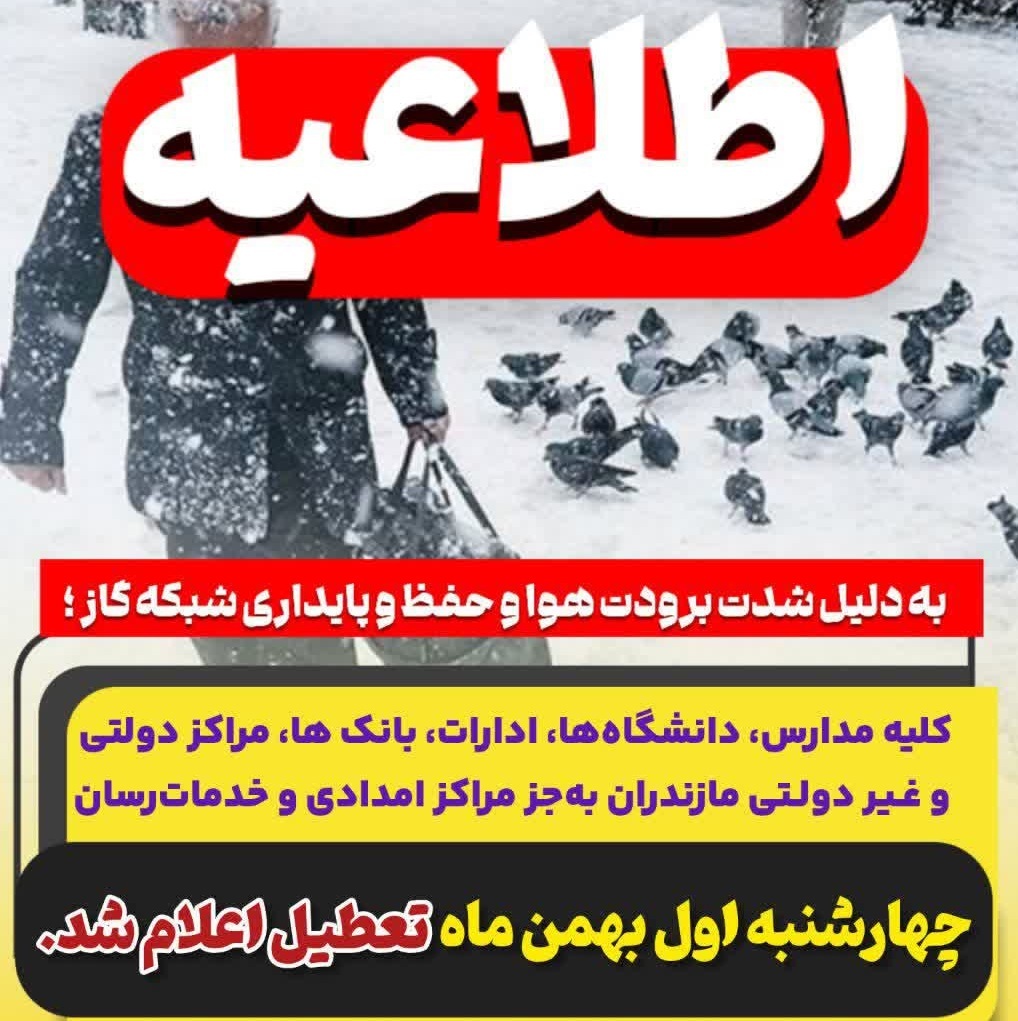 مدارس، دانشگاهها، ادارات، بانک ها، مراکز دولتی و غیردولتی مازندران بهجز مراکز امدادی و خدماترسان چهارشنبه اول بهمن ماه تعطیل اعلام شد.